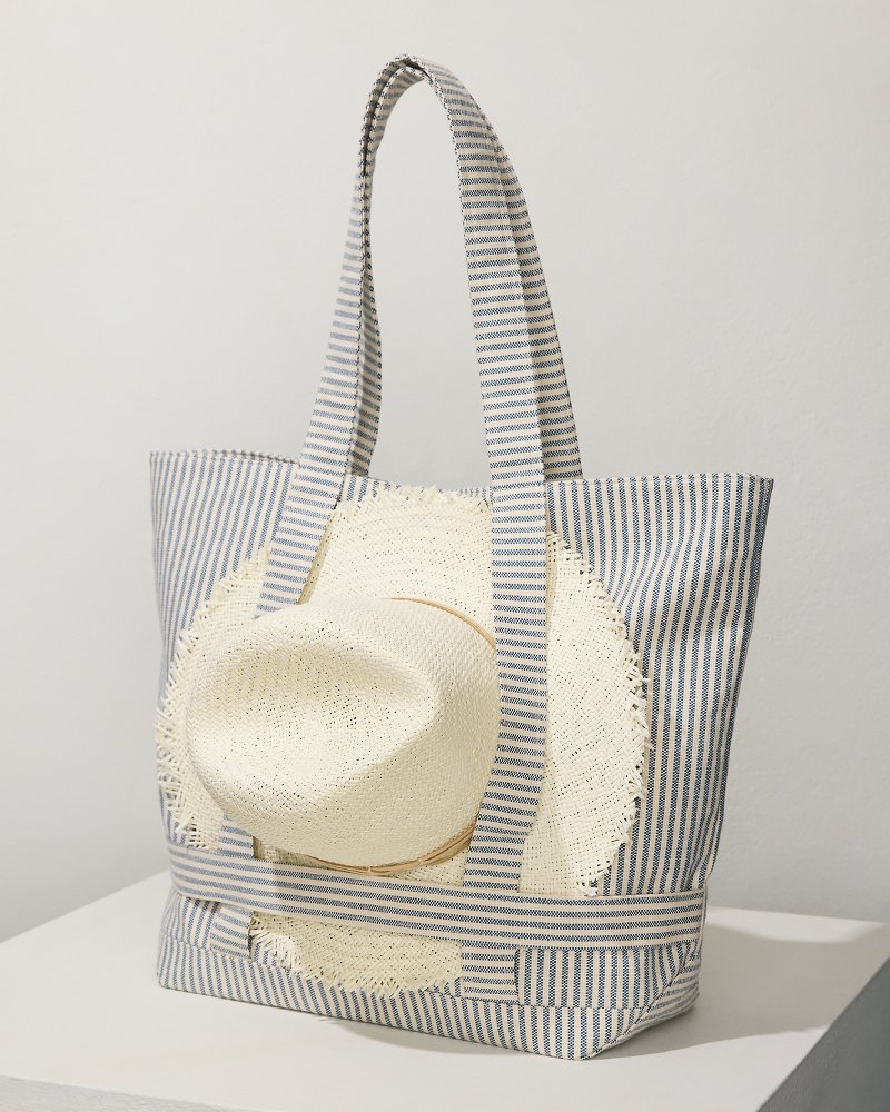 Elegant & classy tote; very well made, not too big, not too heavy/bulky. Gave it to a friend of mine for her b-day; she LOVES the "hat-carry-on" built-in feature. We also agreed on how wise it is to have those stripes printed vertically, not horisontally🦓Thank you, Tommy Bahama, for yet another beautiful yet useful acessory!