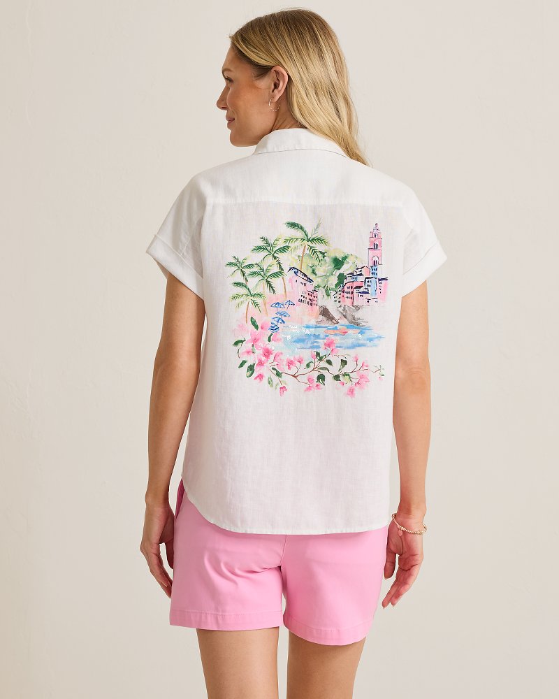 The camp shirt is made of a soft linen. Love the design on the back! My main feedback is the shirt runs large. I bought a small & usually wear a medium. So it feels large except when I move my arms forward. I think due to the sleeves which are not inset. The sleeve is just part of the bodice. So sometimes it’s uncomfortable. Would not buy this style again