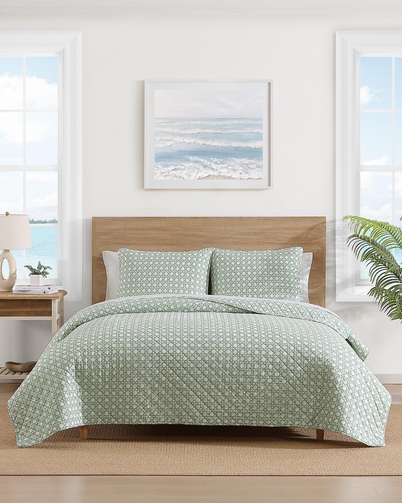 [This review was collected as part of a promotion.] I was excited to try out this Tommy Bahama diamond isle green quilt! I love the color, so relaxing for a bedroom. The quality is great and is comfortably soft. It is however, a little thin and I need another blanket while sleeping.