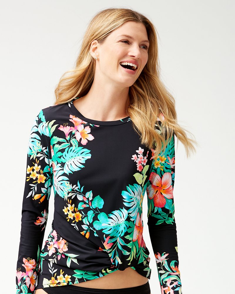 Love the tropical print rash guard. Previously bought the bandeau swim suit and dress in the same print, so had to have the long sleeve top to match. Perfect vacation wear