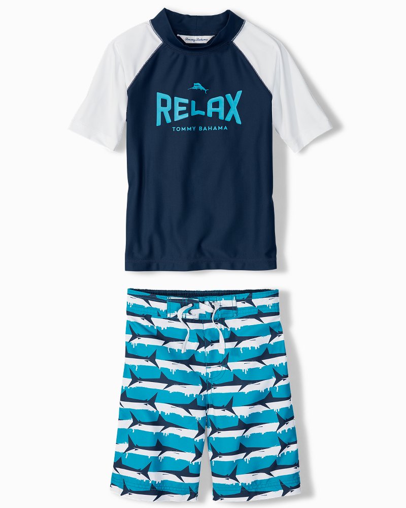 I bought this rash guard set a few weeks ago and I’m glad I did. My son loves the print and I like that it stands out a bit. Perfect for trips to water parks. The fit is true to size and with the draw string I can make it a bit tighter or looser as he grows. I recommend this rash guard.