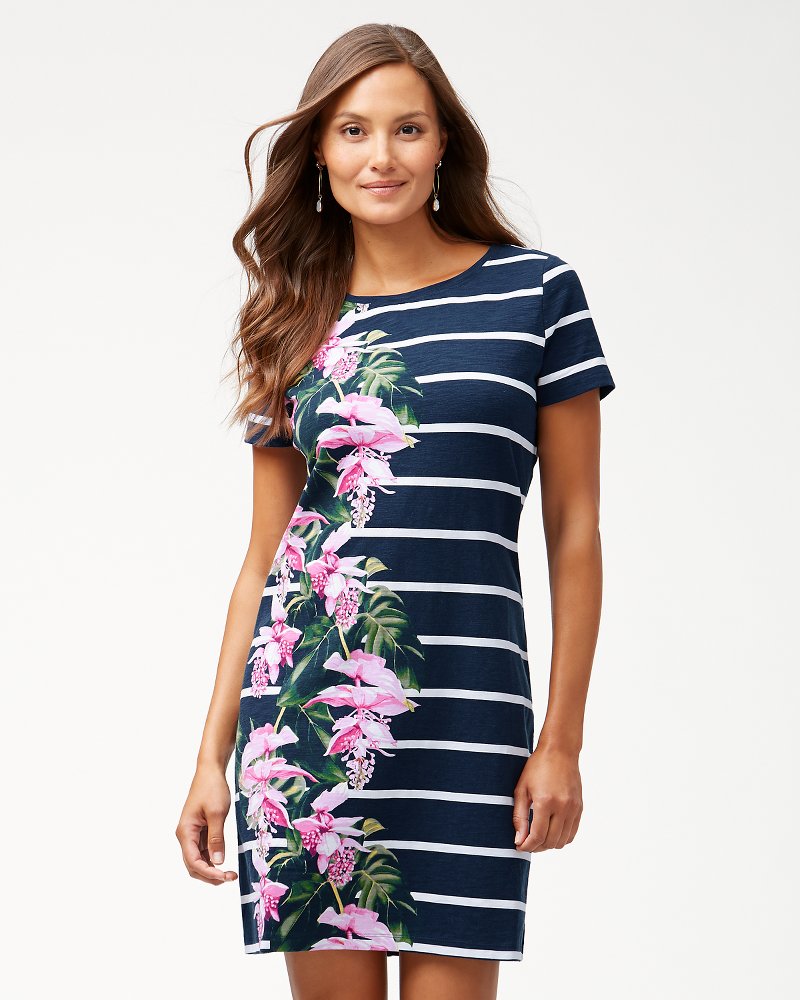 I love Tommy Bahama dresses because they fit beautifully, are comfortable to wear and drape beautifully. This dress is no exception. I love the pink hibiscus flowing down the front of this dress. It is comfortable and I get a lot of compliments on it when I wear it.