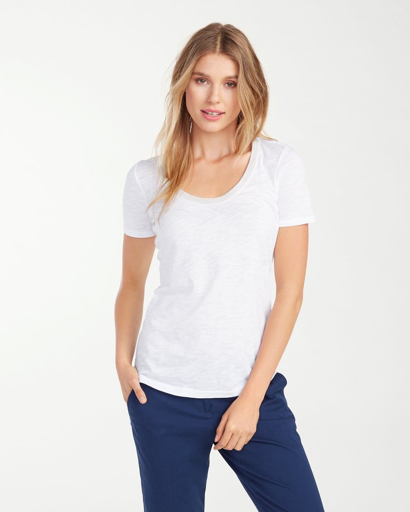 Bought this tee in white and navy. Love the fit, love the shimmering beads on the scoop neckline. Can be worn with or without a pendent and earrings, jeans or nice pair of pants and look elegant. Love the tees! Thx TB,