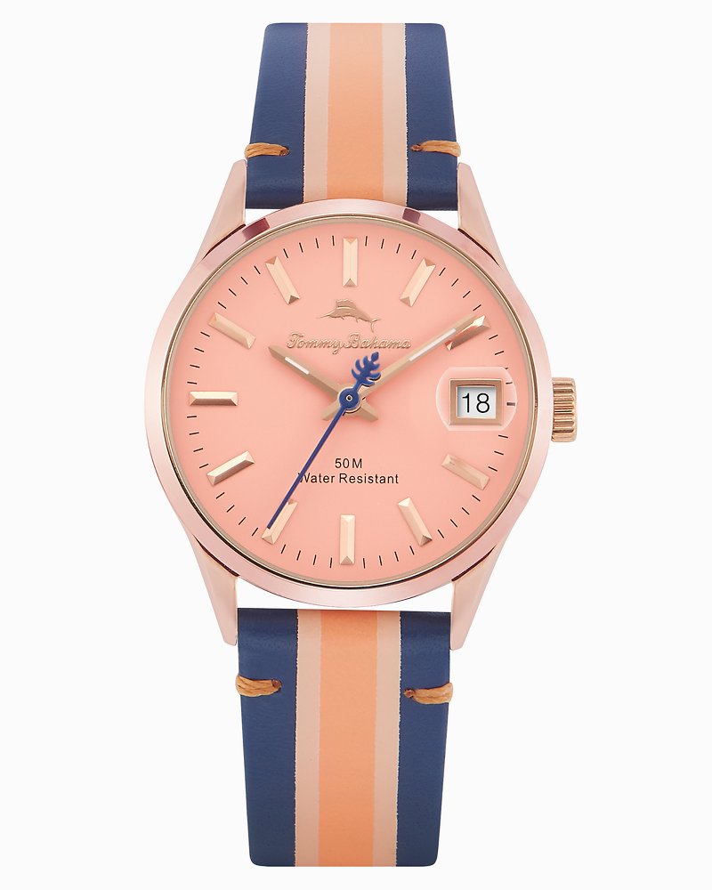 Rated 4 out of 5 by from Great Water Resistant Watch Bought this as a summer watch for a change from my silver link Swiss Army watch. Love that it's water resistant. I like the colors and debated between this one and the teal and coral colored version. I like that the date is magnified so I can see it. The gold hands are a little harder to see on the pink than in the picture, especially in dimmer lighting. I really like the rose gold color on my skin. I am a little surprised it doesn't match everything the way I thought it would, mostly because of the dark blue strip.I think with the dark blue, I may end up wearing it more in the fall and winter with jeans. But, overall I am very happy with this watch.